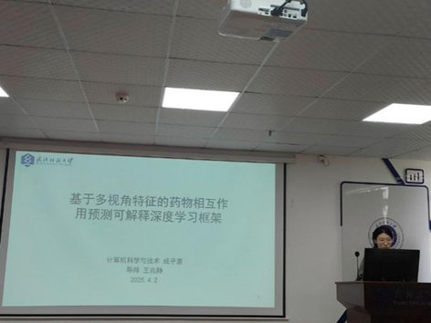 成子惠同學分享的主題是「A Multi-View Feature-Based interpretable Deep Learning Framework for Drug-Drug Interaction Prediction」。當患者同時服用多種藥物時,藥物間相互作用(DDIs)會導致有害後果。因此,準確預測 DDI 至關重要。然而,现在的方法僅集中於單一視圖特徵,如原子視圖特徵或子結構視圖特徵,從而限制了對 DDI 預測的準確性。基於多視角特徵的可解釋性研究比較稀少。多視角特徵對於追蹤相互作用至關重要。針對這一空白,她提出了MI-DDI,一種基於多視角特徵的可解釋性深度學習框架。為了充分提取多視角特徵,她採用了消息傳遞神經網絡從RDkit生成的分子圖中學習原子特徵,同時從藥物 SMILES 中學習子結構視圖嵌入。這些原子視圖和子結構視圖特徵合併成一個整體藥物嵌入矩陣。隨後,精心設計的交互模塊不僅為理解相互作用建立了一條可行的途徑,還直接為權重矩陣的構建给予了信息,這樣就能進行精確、可解釋的相互作用預測。在BIOSNAP數據集和DrugBank數據集上的驗證表明了MI-DDI 的優越性。