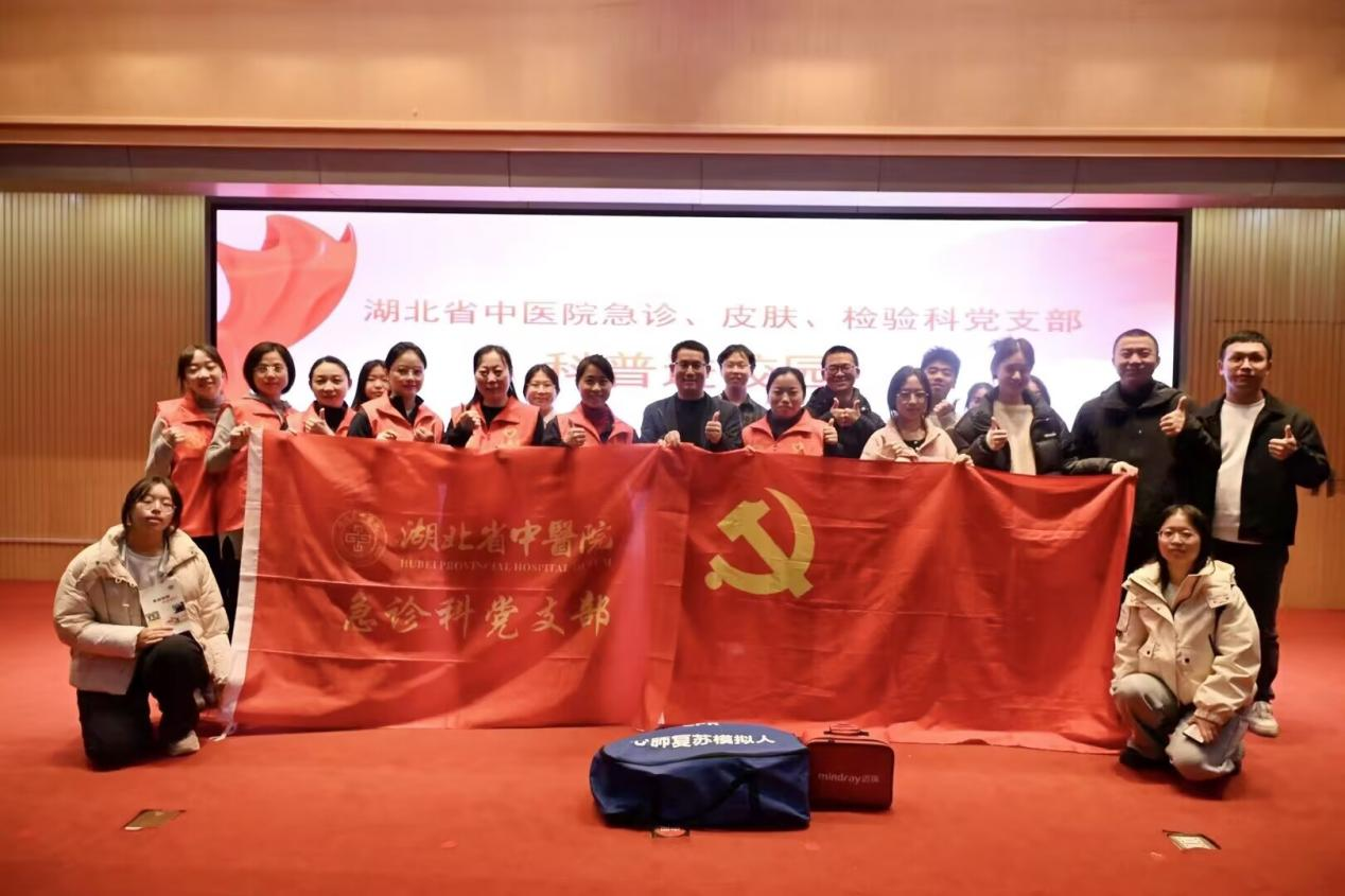 隨後,湖北省中醫院專家團隊帶來了一場內容豐富、乾貨滿滿的宣講與培訓:急診团支部李剛主任細緻解析急性心梗的識別要點與急救流程,讓師生清晰掌握突發心臟疾病的科學應對方法;皮膚科团支部白書仙醫生深入淺出講解常見皮膚病的識別技巧與認知誤區,助力大家科學區分皮膚問題、規避錯誤護理方式;護理專家吳雨曦藉助辦公操教學視頻,帶領現場師生起立跟隨演示,並逐一講解每個動作的發力要點與舒緩功效,讓大家在實操中掌握緩解疲勞的實用方法;肖潔、黃明霞、張培、顏雙雙等急救專家詳細講解海姆立克急救技術、心肺復甦(CPR)及自動體外除顫器(AED)的使用要點,結合動作演示讓核心操作流程更加通俗易懂;檢驗科技師饒珺同步给予現場血糖檢測服務,為師生即時掌握自身健康狀態给予貼心參考。