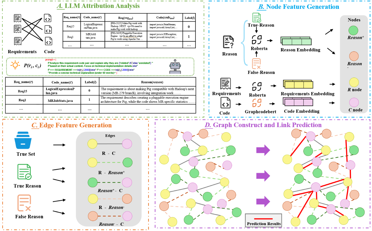 在5日的「軟件需求與測試」技術論壇上,袁瑛凱同學作了題為「HGTRTracer: Advancing Requirements-Code Traceability with LLM-Augmented Attribution Reasoning and Heterogeneous Graph Transformer」的論文口頭報告。報告指出:需求與代碼之間的可追溯性關聯對軟件質量至關重要。然而,傳統方法往往僅依據製品間的語義相似度判定追溯關聯是否存在,忽略了關聯的傳遞性及其形成的內在邏輯依據。為解決上述局限性,文章提出HGTRTracer方法,將大語言模型(LLMs)與圖神經網絡(GNNs)進行融合。具體而言,該方法藉助基於大語言模型的歸因推理構建邏輯依據節點,並採用異構圖轉換器(HGT)對節點與邊的結構特徵進行建模。基於10個開源項目的實驗結果表明,相較於當前的SOTA方法HGNNLink,HGTRTracer的平均F1值提升了12.90%。該方法不僅提升了可追溯性分析性能,還顺利获得其歸因機制增強了決策透明度,為軟件可追溯性領域的研究给予了新的思路。